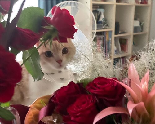 「バラが似合う男、猫氏」カラー生活3日目のオキエ家です。 家族全員揃うから心強い、という理由で還暦祝いの日に去勢手術を予定しました。 当日は絶食なのが一番つらかったです。朝5時半からミャーミャーミャーとそれはそれはお訴えなさる。病院に連れて…